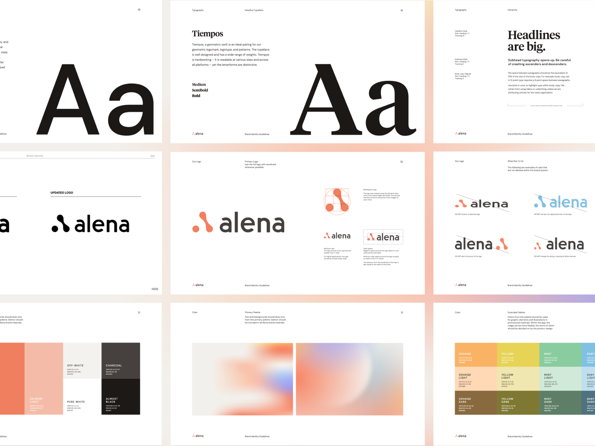 At the beginning of our relationship, Alena was an app in beta that had just decided on a new name and needed a brand identity. With the goal to develop something coherent and original, we helped Alena define their personality, and ultimately establish a set of brand standards to inform all of their verbal and visual communications.