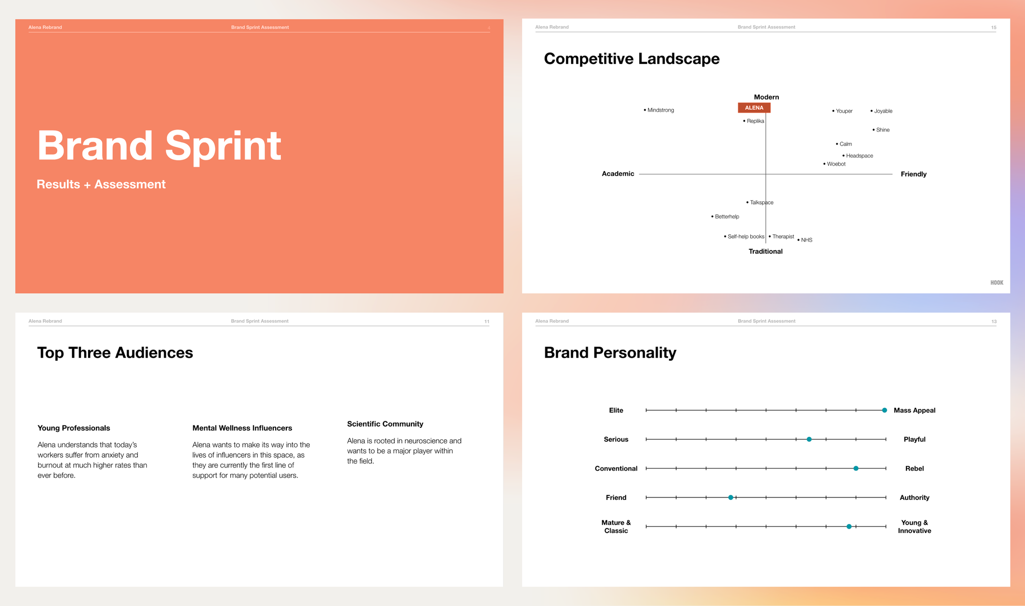 During the competitive landscape exercise, it quickly became clear there was an opportunity to position Alena closer to ‘Academic’ and ‘Modern,’ which was the least populated quadrant with other brands in the mental health space.