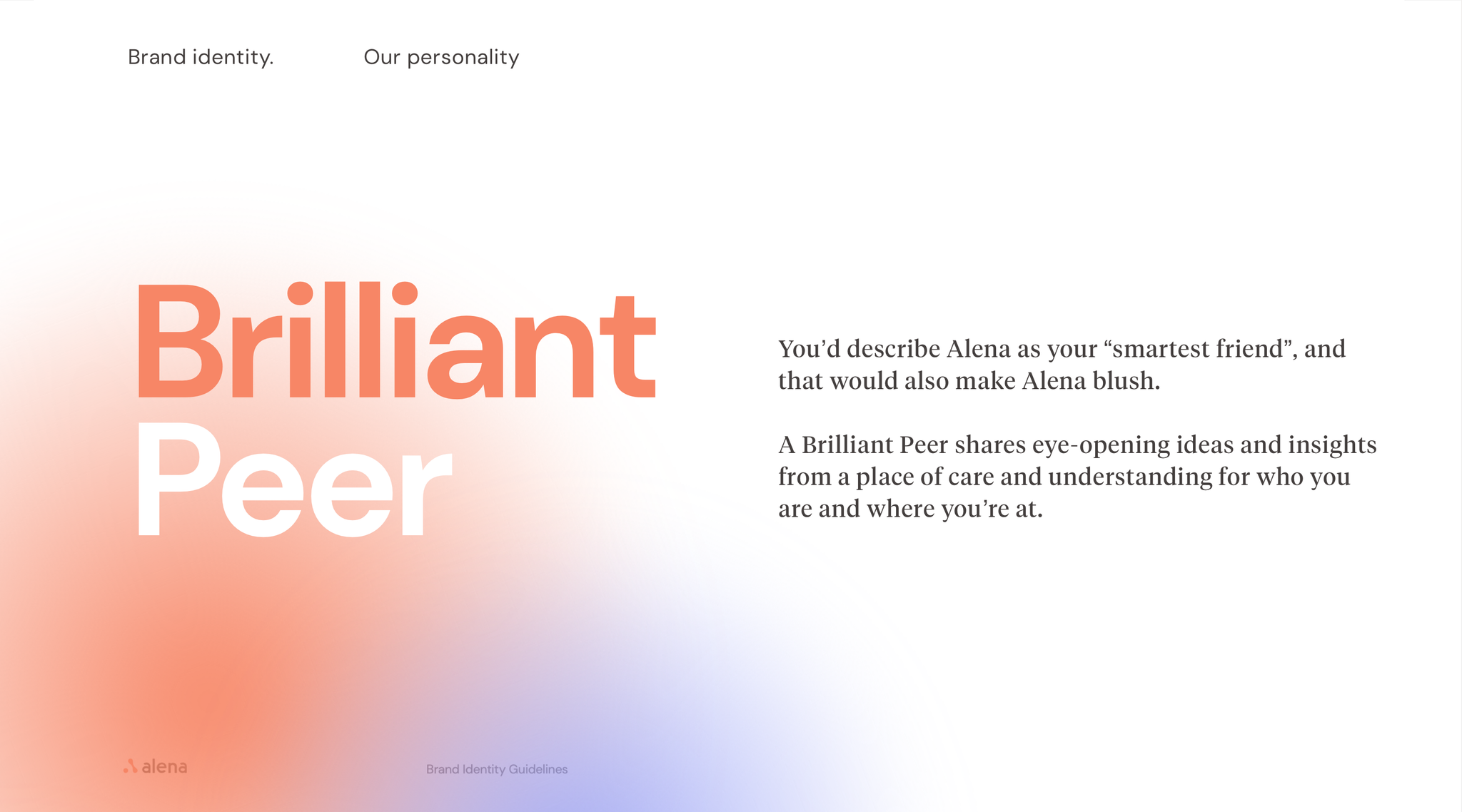 In terms of personality, Alena is both intelligent and approachable, and we articulate this brand persona through the concept of ‘Brilliant Peer: A thoughtful friend who shares eye-opening ideas and insights from a place of care and understanding for who you are and where you’re at.’